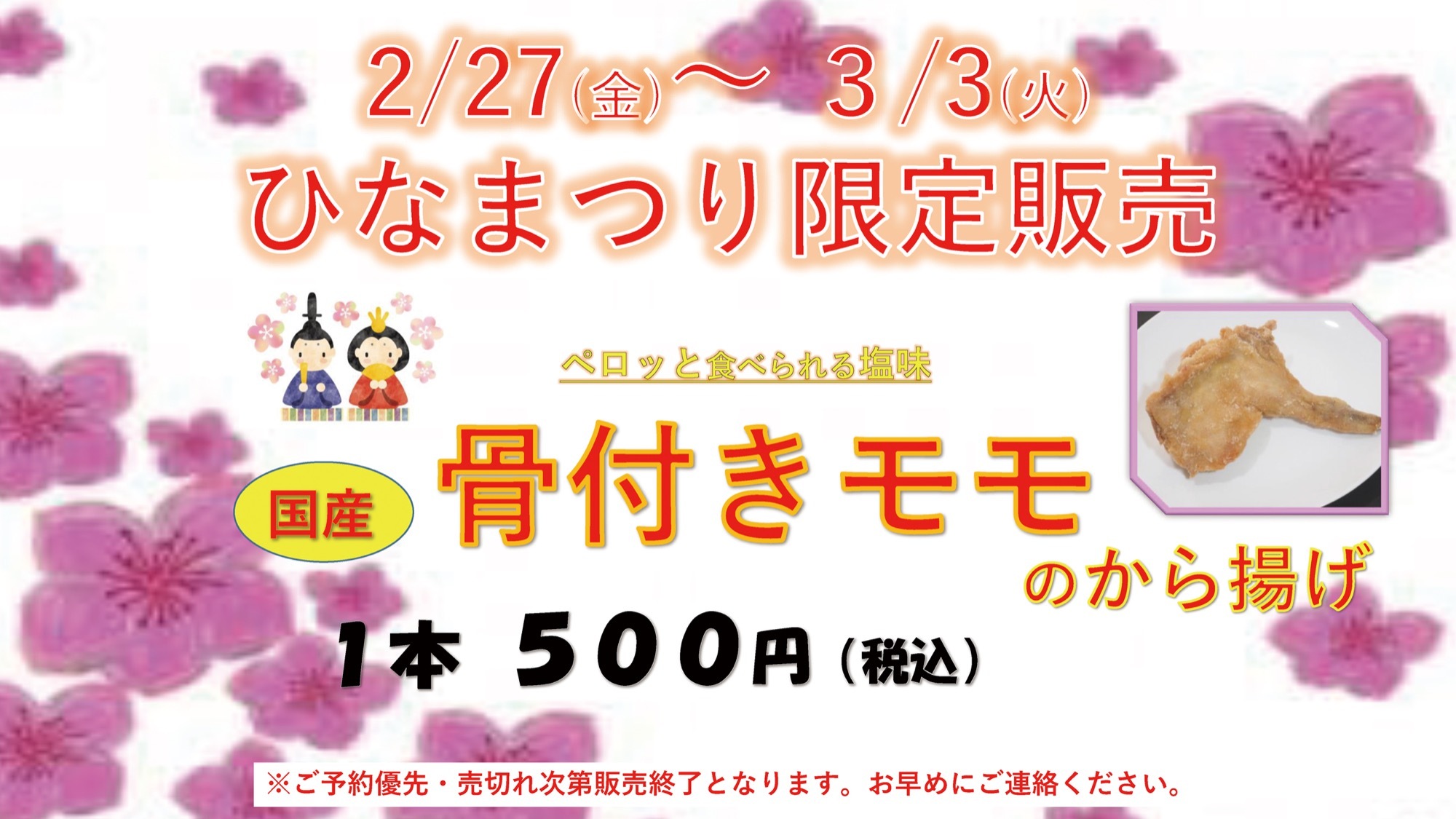ひなまつり骨付きモモ販売のお知らせ
